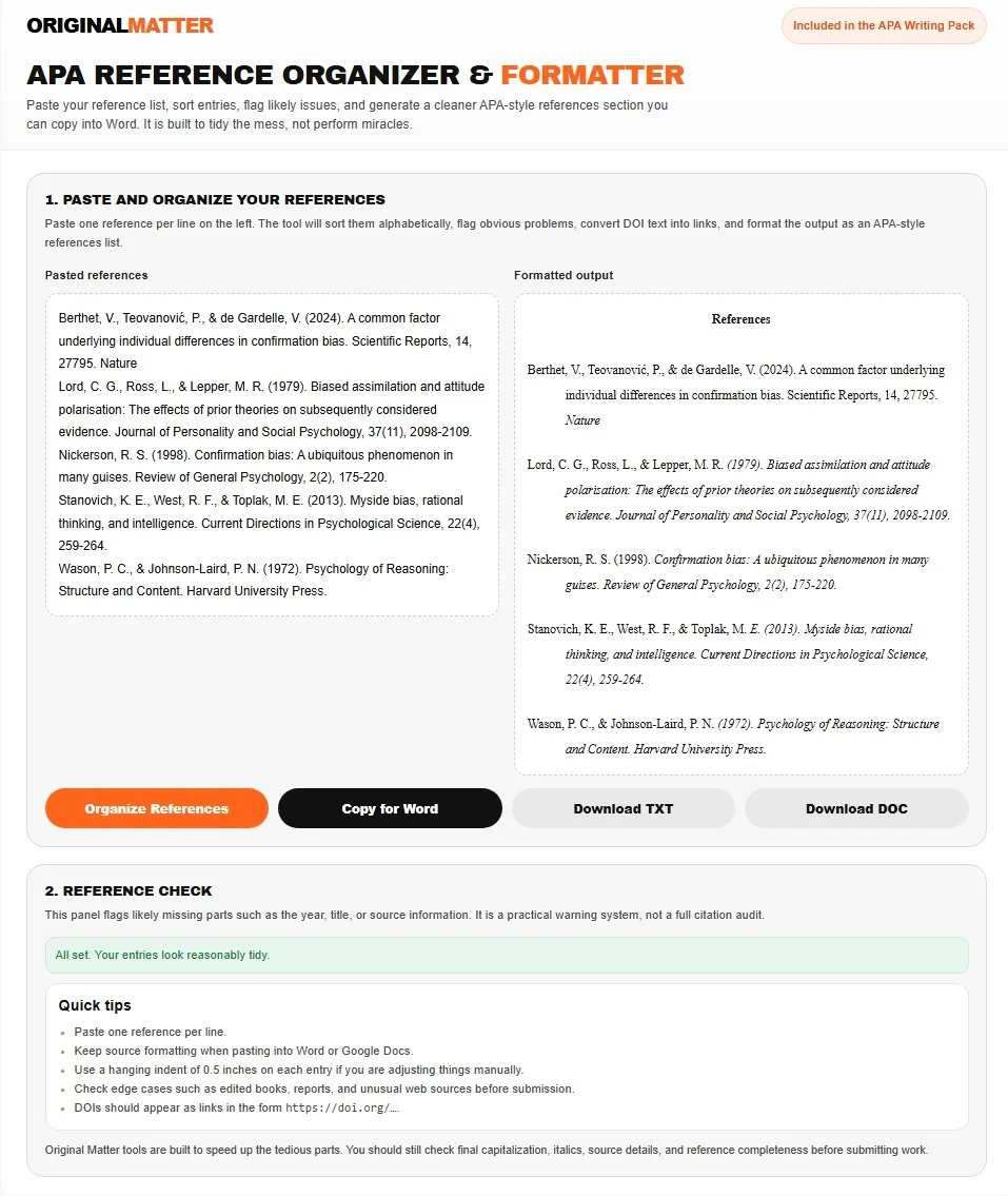 The In-Text Citation Converter helps psychology and social science students clean up citation formatting, handle awkward author combinations, and get closer to a consistent APA style without manually second-guessing every bracket. The Reference Organizer & Formatter handles the other half of the same mess, because in-text citations and reference lists have a habit of falling out of step together rather than separately.