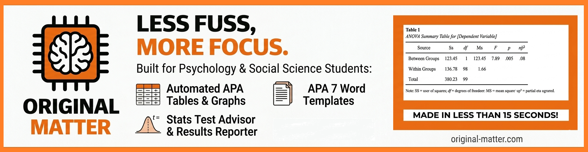 The Original Matter Formatting Pack includes the full Results Reporter, built to help turn common psychology statistics into cleaner APA-style results sentences. It is there for the usual suspects: t-tests, correlations, chi-square, ANOVA, regression, and the little reporting details that somehow become everyone’s problem at 11:48 p.m.